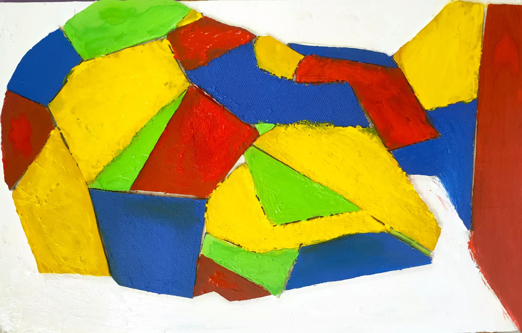 'Fragmented Identity' explores the complexity of human nature through bold, geometric shapes and vibrant colors. Each colored segment represents a different aspect of the self, pieced together to form a cohesive yet multifaceted whole. The use of primary colors and sharp lines creates a striking visual impact, encouraging viewers to contemplate the diverse and interconnected facets of identity. This piece invites reflection on how we are composed of various experiences and traits, unified in our individuality.