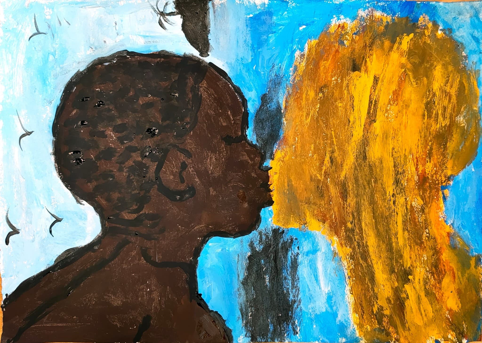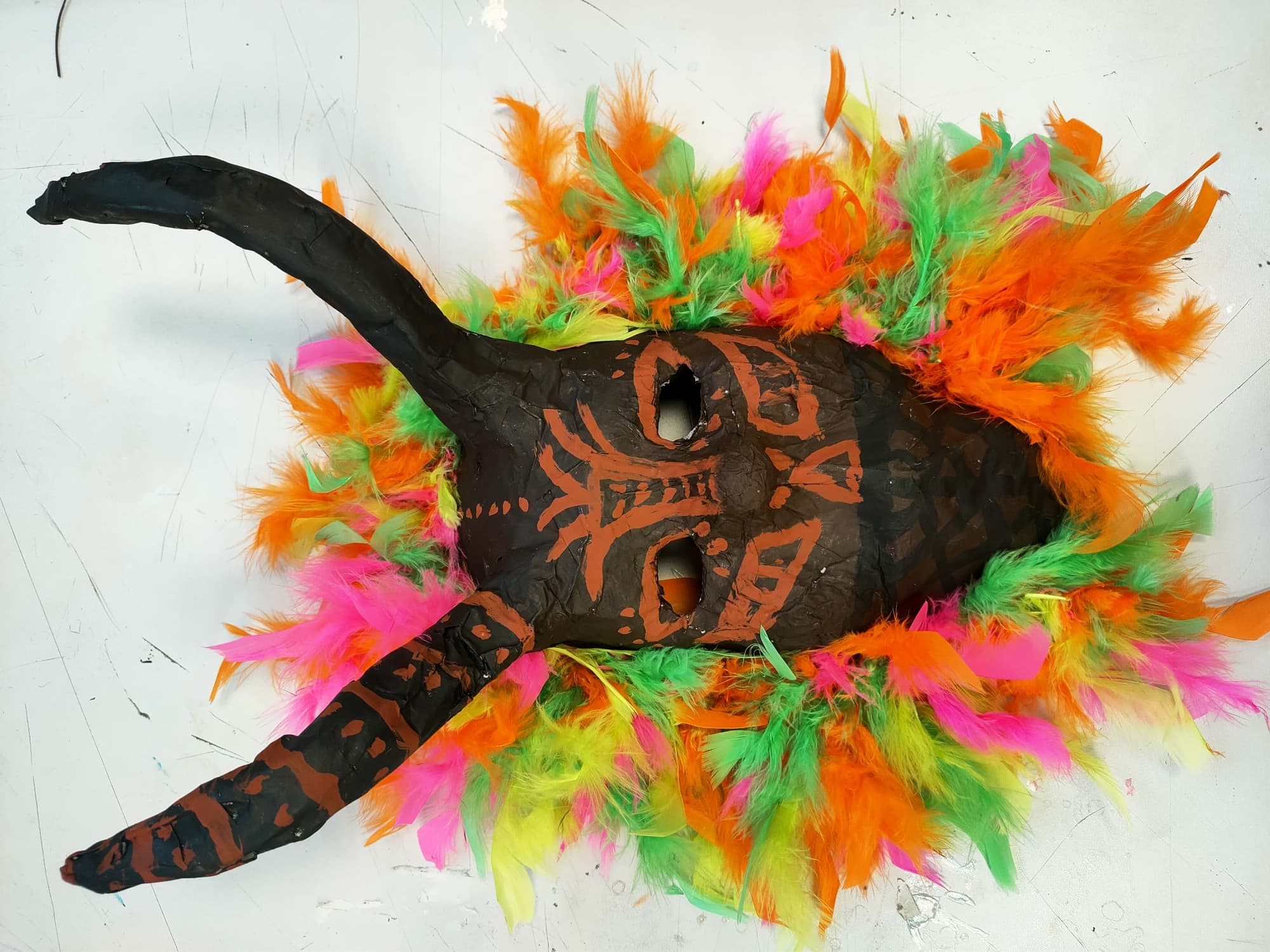 I explore the fusion of traditional and contemporary elements. The mask, with its bold tribal patterns and striking horns, is adorned with a colorful array of feathers, symbolizing vitality and cultural richness. This piece celebrates the beauty of ancestral art while adding a modern twist through vivid, neon hues. It invites viewers to appreciate the depth of heritage and the lively spirit it embodies.