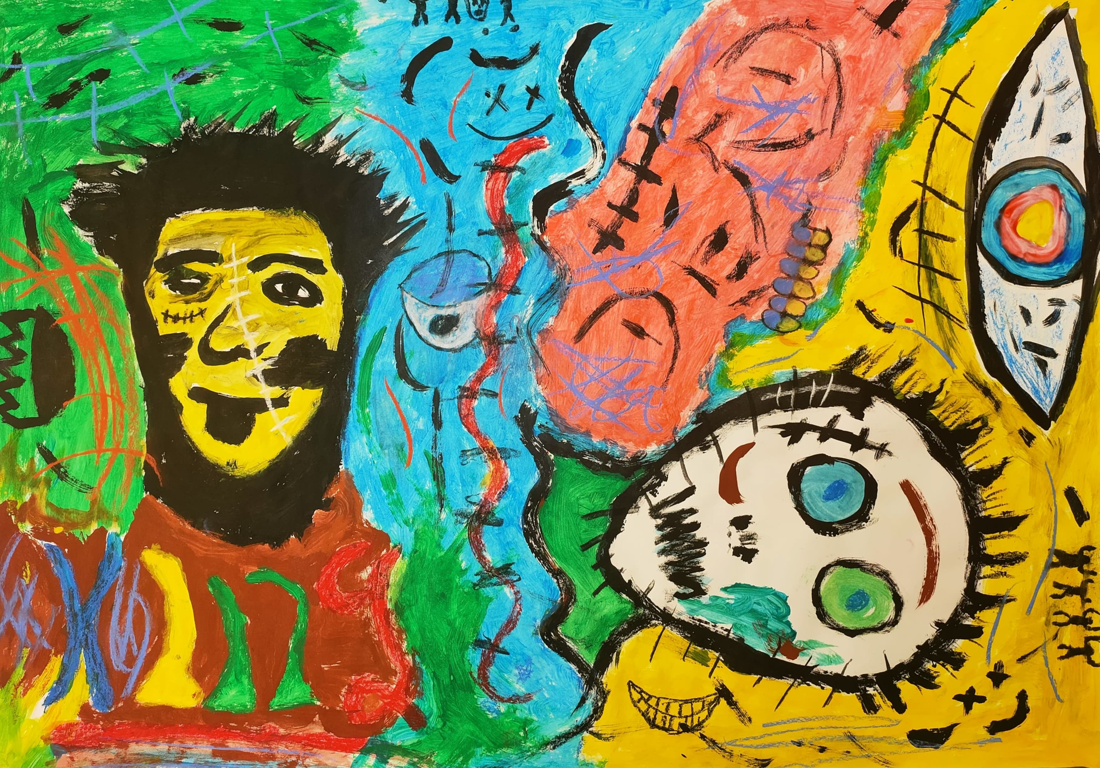 'Whimsical Chaos' is a vibrant and energetic piece that explores the intersection of abstract and figurative elements. The bright, contrasting colors and expressive lines create a sense of playful disorder. The faces and symbols scattered throughout the composition invite viewers to find their own meaning in the chaos. This work is a celebration of imagination and spontaneity, capturing the unpredictable nature of creativity.
