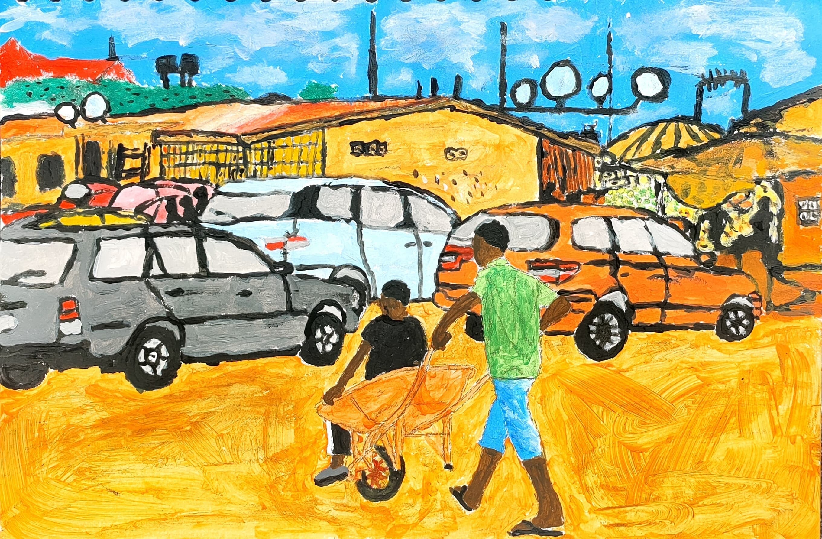 This painting captures the energy of a busy market day with vibrant yellows and oranges. The two figures in the foreground, one pushing a wheelbarrow, highlight the daily hustle. The background, filled with cars and market structures, blends modernity with traditional market chaos. The bold brushstrokes and vivid colors bring the scene to life, inviting viewers to experience the lively atmosphere.
