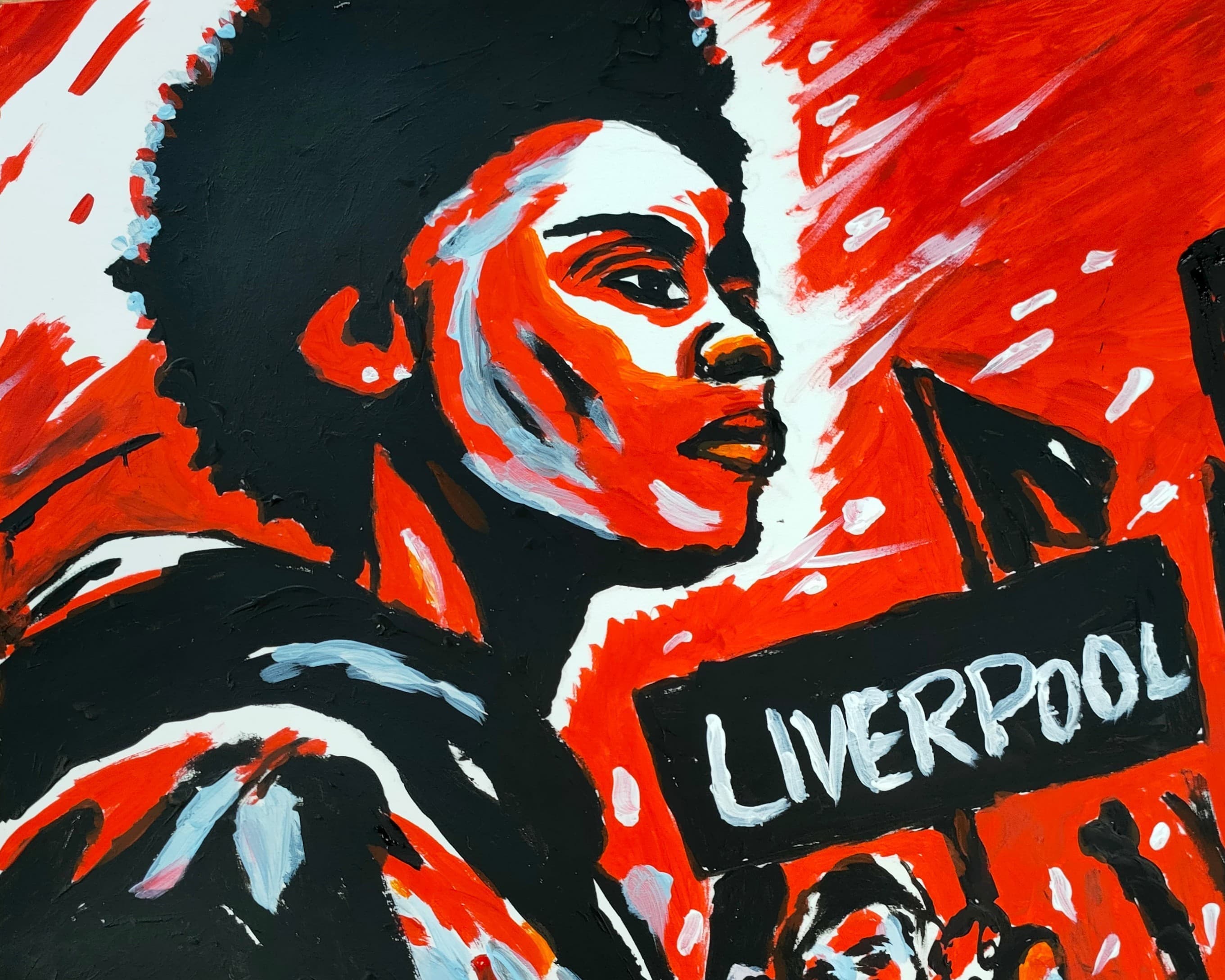 In 'Liverpool Pride,' I capture the powerful spirit of a protester, their determined expression bathed in striking red and black hues. The bold color palette and dynamic brushstrokes convey the intensity and passion of the moment. The figure's resolute gaze and the prominent 'Liverpool' sign symbolize solidarity and the fight for justice. This piece aims to evoke a sense of strength and community, inviting viewers to reflect on the power of collective action.